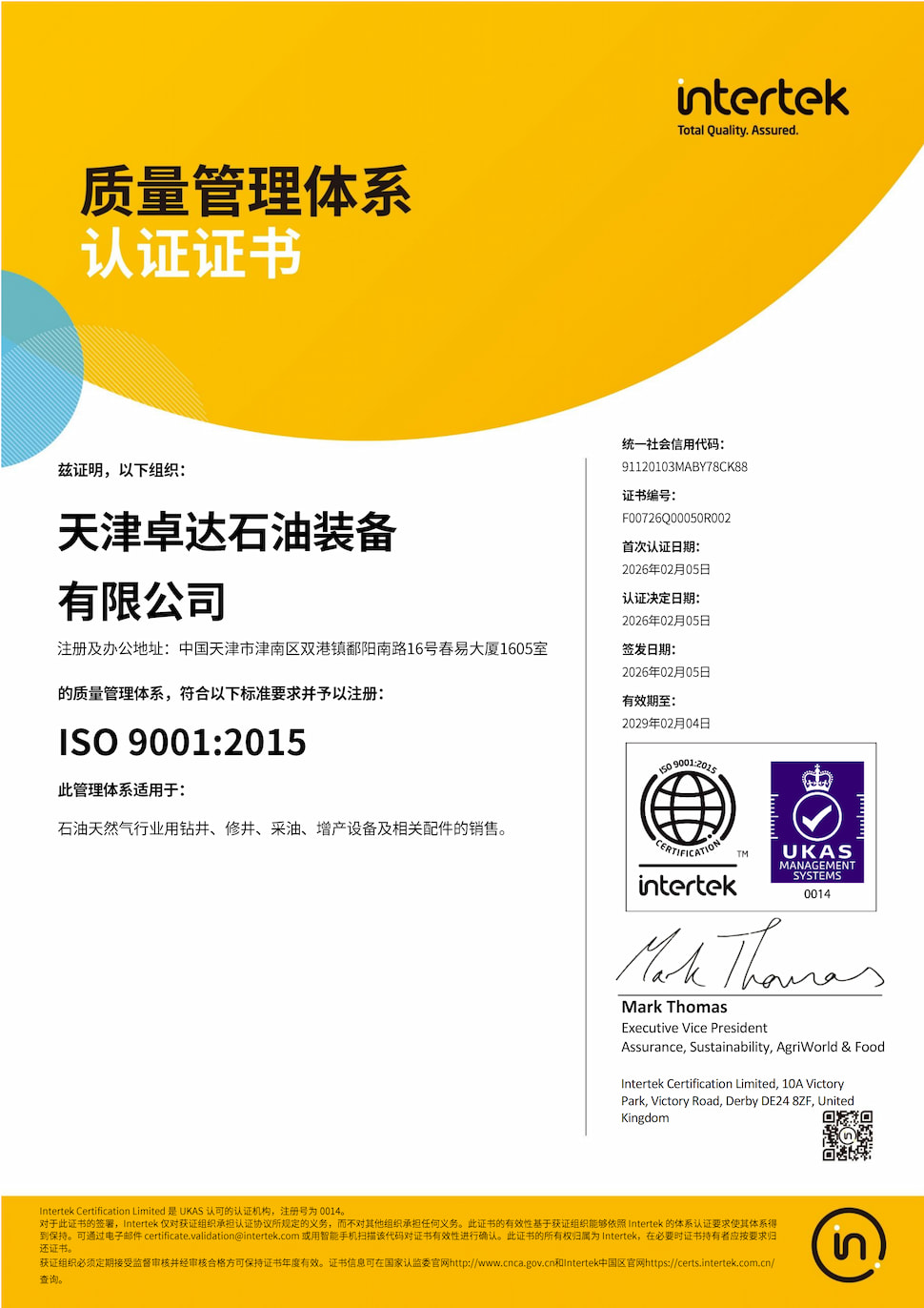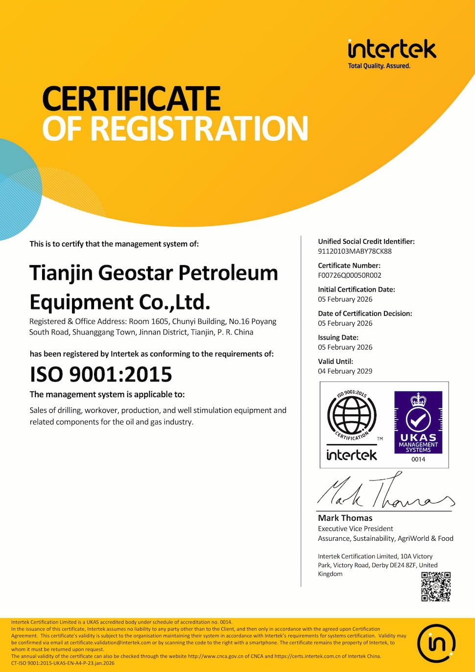 Tianjin Geostar (Tianjin Geostar Petroleum Equipment Co., Ltd.) is proud to announce that it has officially been awarded the ISO 9001:2015 Quality Management System (QMS) certification in February 2026. This significant milestone marks the successful culmination of a dedicated, company-wide effort that began in June 2025.